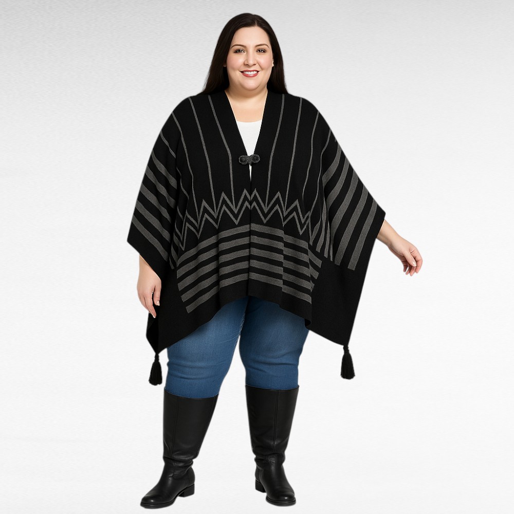 Tyylikäs musta-harmaa ”Shery Star” poncho tuo asuusi sekä lämpöä että klassista eleganssia.
