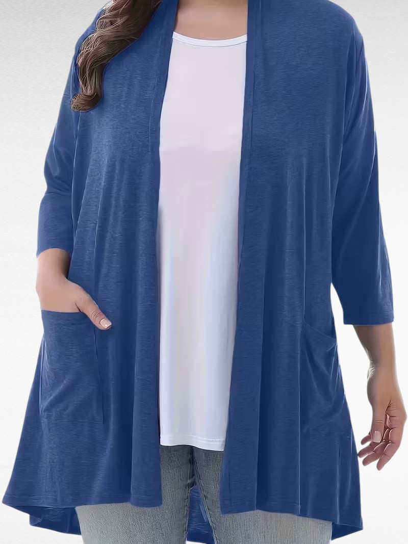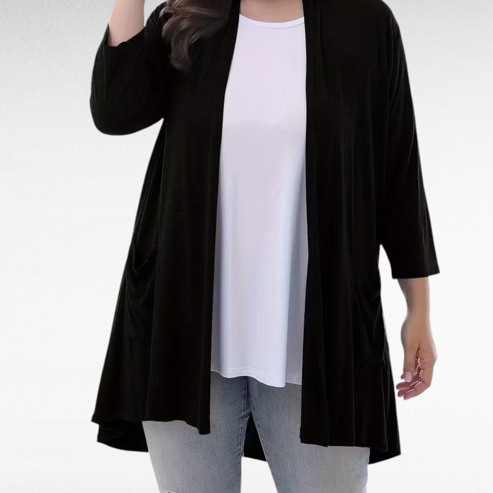 Tämä kevyt, pehmeä ja joustava taskullinen yksivärinen kardigaani on luotu olemaan arjen luottovaate. Hieman levenevä malli lisää siroutta, ja vaate istuu väljästi ja kauniisti myös isommissa ko’oissa.