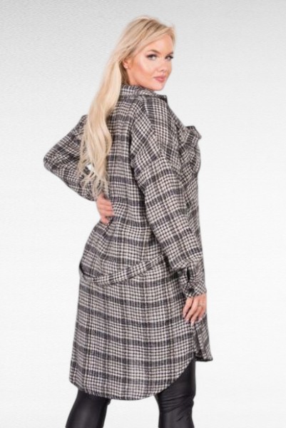 Pitkä harmaa ruudullinen paita/ jakku jossa vyö, rinnalla taskut .