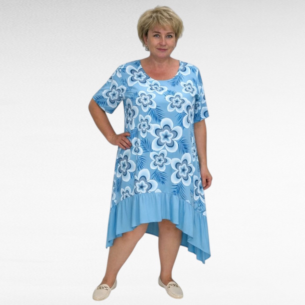 Kukkakuvioinen ”Katja” kesämekko ohuemmasta, hengittävästä viskoosimateriaalista, röyhelö alaosassa, edestä hieman lyhyempi.