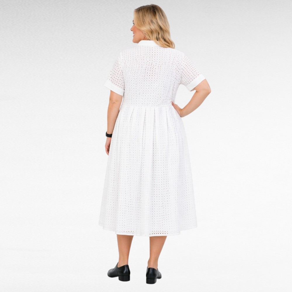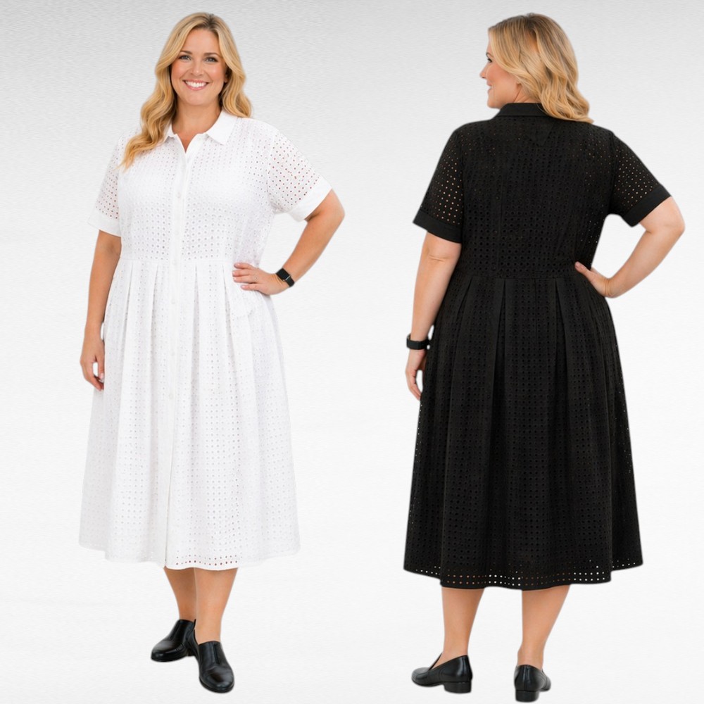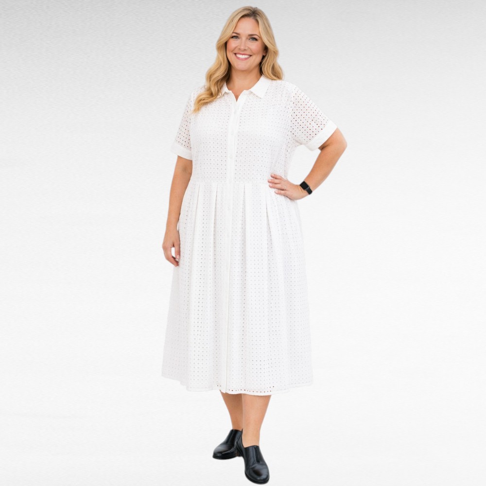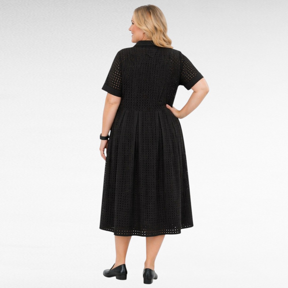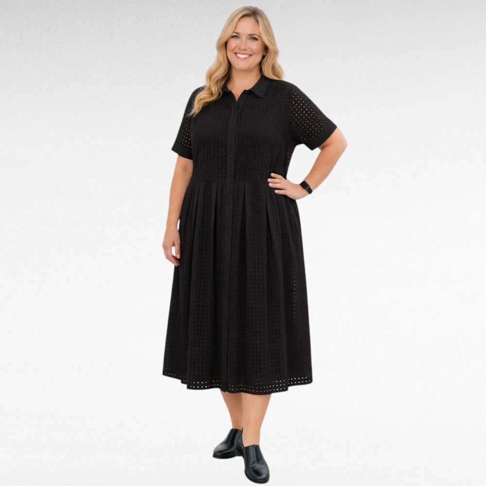Valkoinen tai musta ”Jessica London” brodyyripitsistä vuorillinen mekko Iso- Britanniasta.. Edessä nappikiinnitys, hameosa on leveä. Lyhyet hihat, sivuilla taskut.