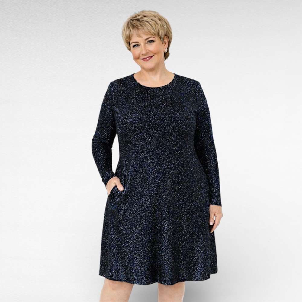 Juhlava laivastonsinien, kimalteleva ja hyvin laskeutuvasta erittäin joustavasta materiaalista mekko, jossa on pitkät hihat ja taskut. Pidemmällä henkilöllä mekko näyttää tunikalta ja sopii hyvin esim. housujen kanssa käytettäväksi.