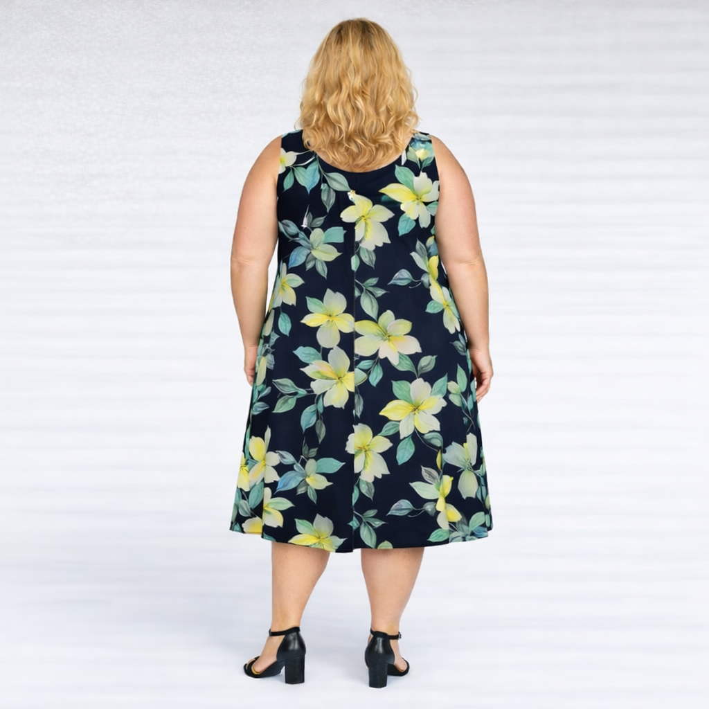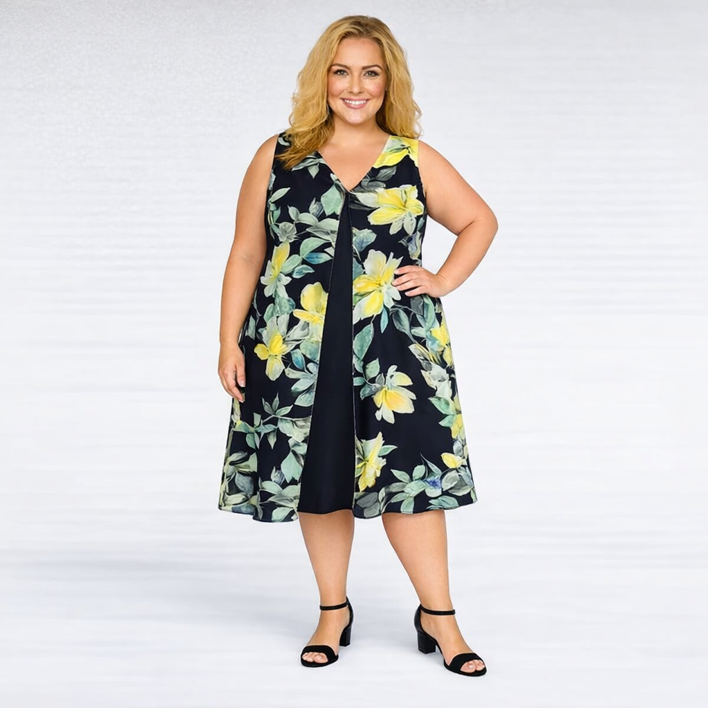 Kaksikerroksinen englantilainen ”Evans” musta mekko keltaisella kukkakuosilla. Yläosa on ilmavasta mustasta keltaisilla kukkakuosilla sifonkikankaasta ja on edestä auki. Alaosa joustavasta mustasta stretch-materiaalista. Malli on hoikentava ja peittää hyvin vatsan.