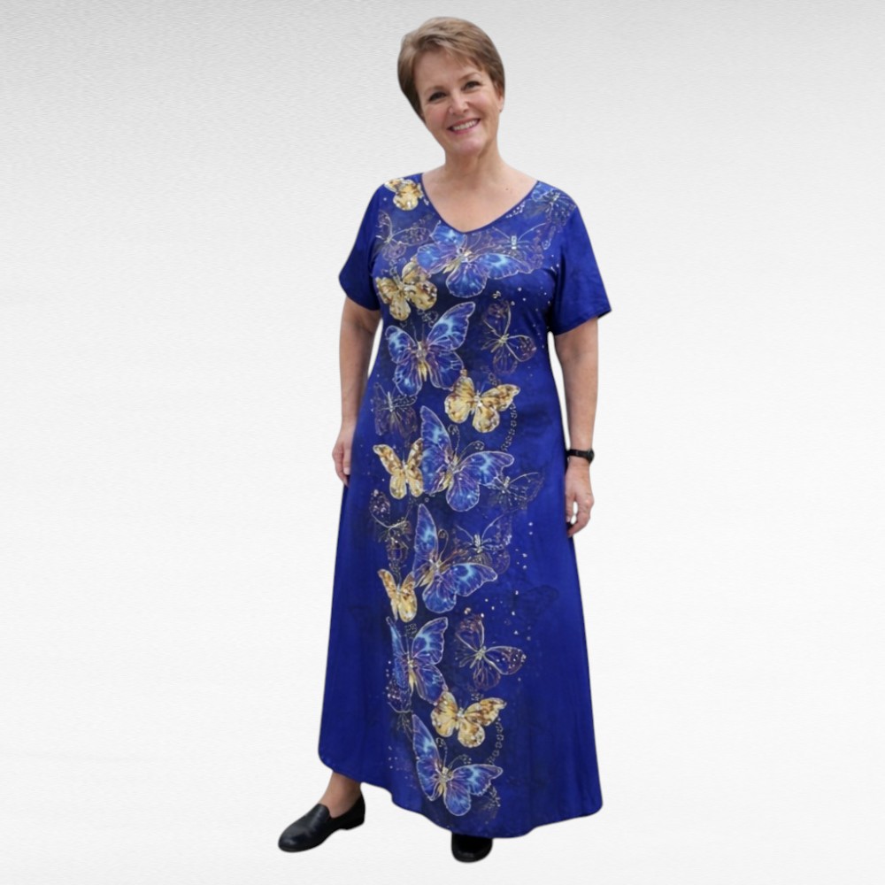 Violetti sinisillä pienillä pilkuilla, joustava, hyvin laskeutuva mekko. Etuosassa on suurikuvioinen kultainen perhoskuvio.