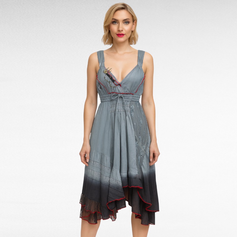 Kaunis ”Joe Browns ” hihaton boho-mekko- pehmeän sinertävänharmaa sävy punaisilla kanteilla ja kevyellä ombré-efektillä helmassa. Edessä on kaunis kirjonta, punaiset kontrastiviimeistelyt sekä epäsymmetrinen, kevyesti hulmuava pitsillinen helma.