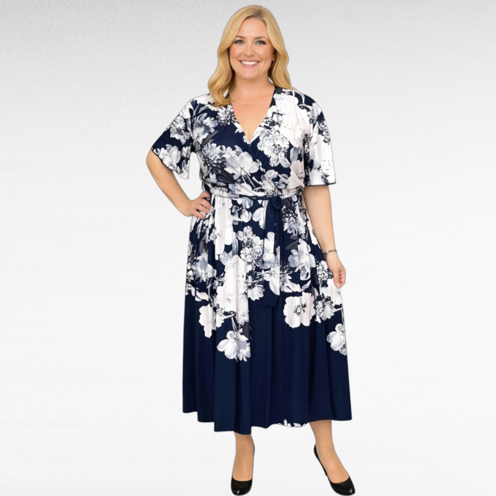 Juhlava ylellinen ”Cruz” maksimekko, jossa vaaleanpunainen kukkakuvio tummalla pohjalla.