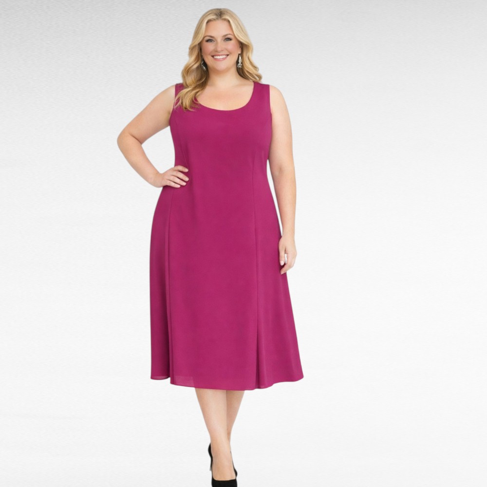 Juhlamekko”Palette” on yksinkertaisen ajaton ja hihaton, klassisella pyöreällä pääntiellä. Olkalinja on siisti ja selkeä, mikä tekee kokonaisuudesta huolitellun ja arvokkaan.