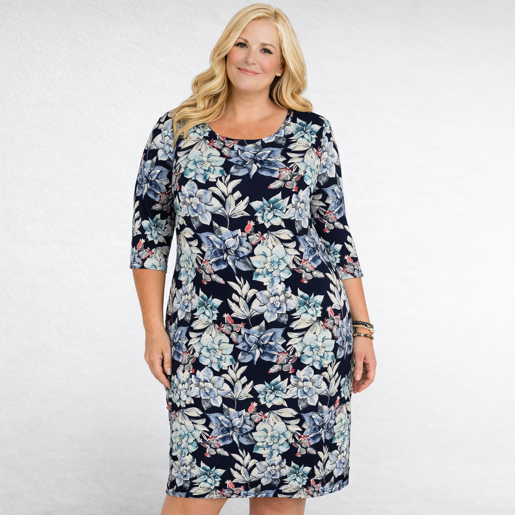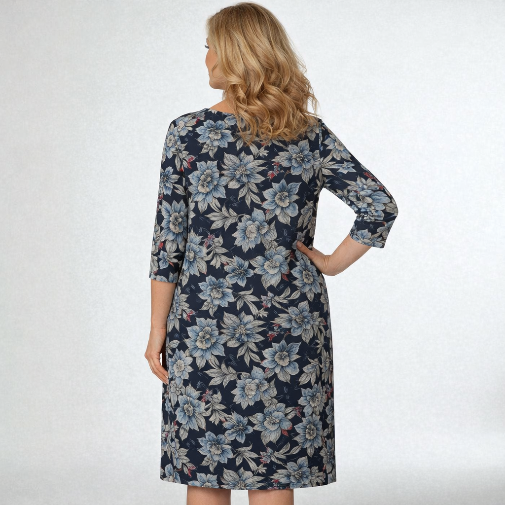 Arjen kauneus löytyy yksityiskohdista – juuri niistä, joita ”Henna”-mekko kantaa yllään. Tummansiniselle pohjalle levittyvä kukkakuvio tuo esiin naisellisen raikkauden, ja joustava materiaali varmistaa, että mekko tuntuu päällä yhtä mukavalta kuin se näyttää.