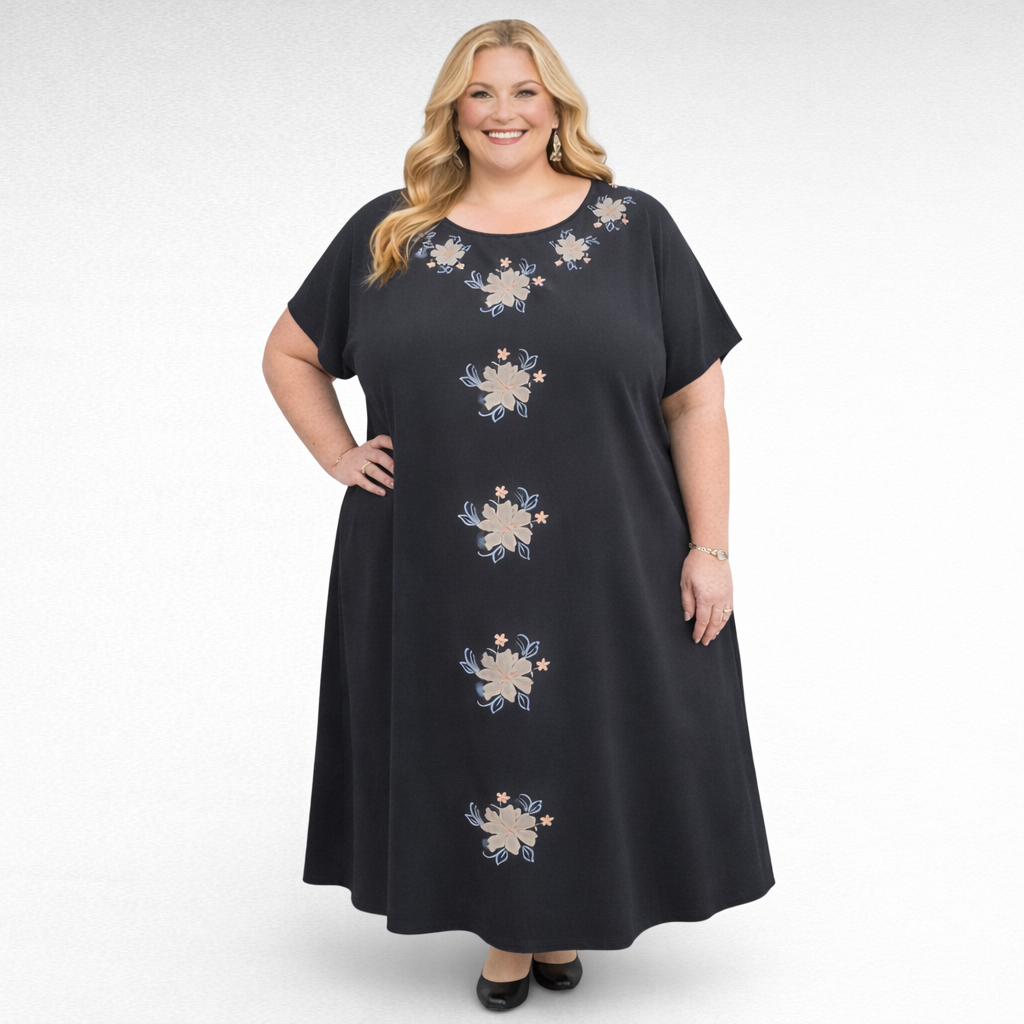 Musta, A-linjainen, ohut ”Marju” maksimekko, jossa beige kukkakuvio. Selänosa on musta.