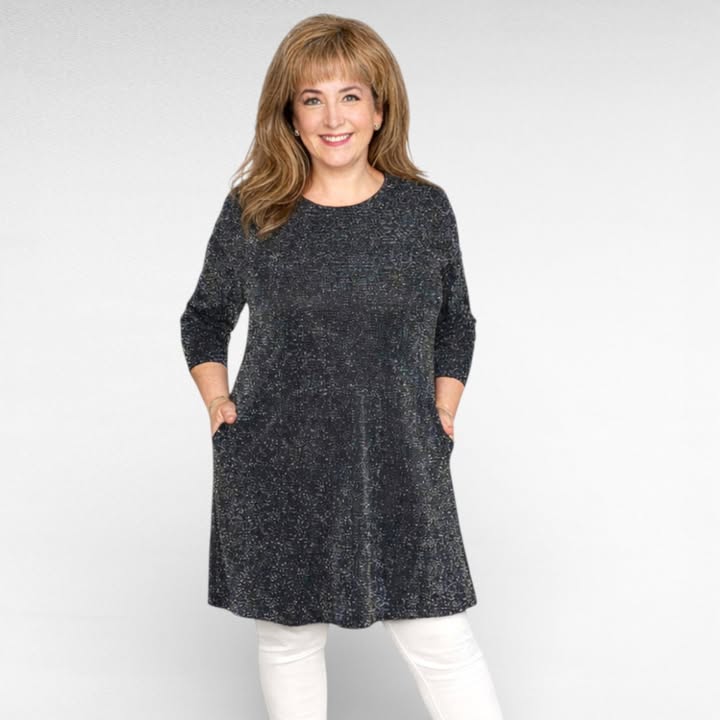 Juhlava musta, kimalteleva ja hyvin laskeutuvasta erittäin joustavasta materiaalista mekko, jossa on pitkät hihat ja taskut. Pidemmällä henkilöllä mekko näyttää tunikalta ja sopii hyvin esim. housujen kanssa käytettäväksi.