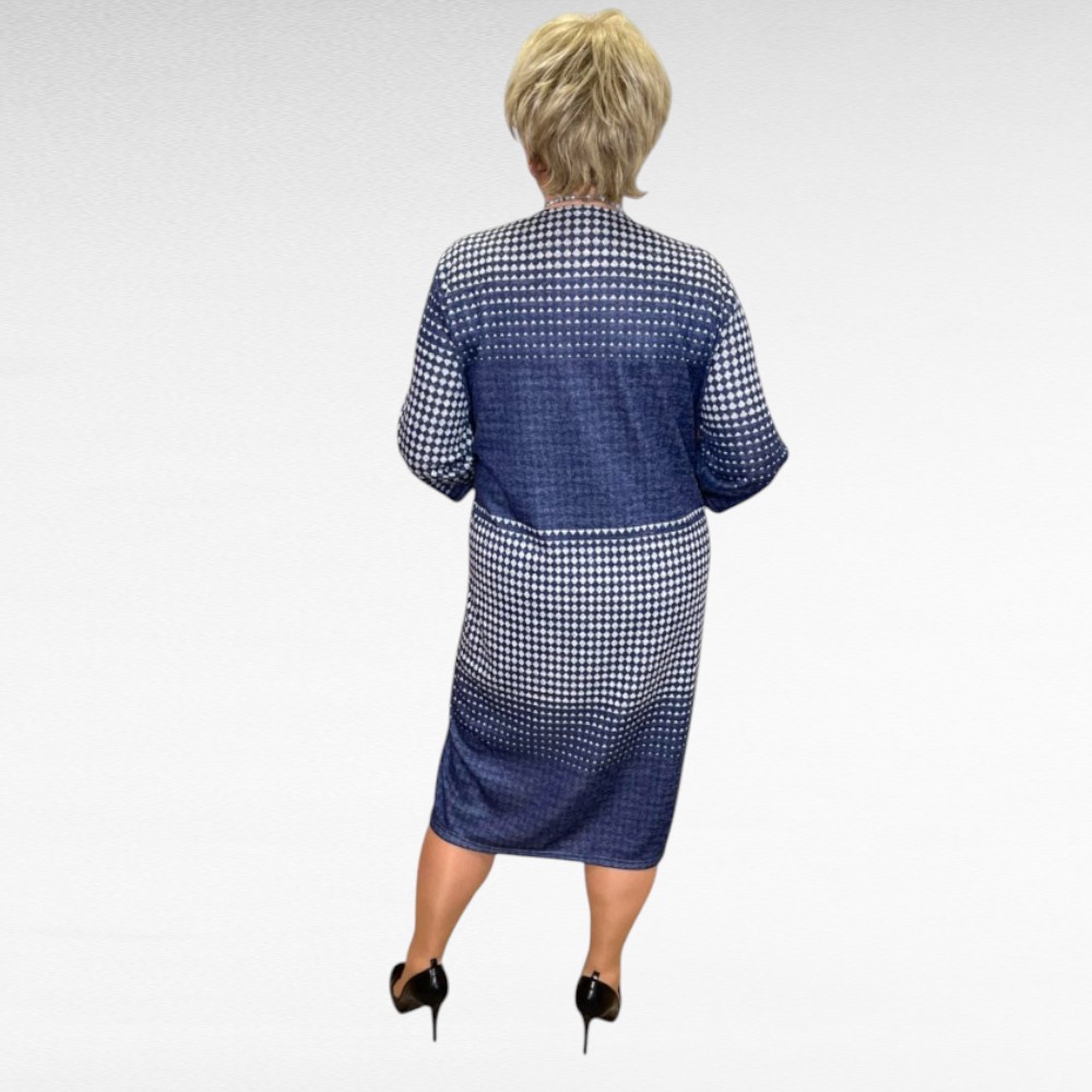 Erittäin kaunis ja naisellinen siniharmaakirjavasta, pieniruutuisesta, joustavasta materiaalista, arkipäiväinen, kolmen neljäsosan pituisilla hihoilla lämmin syys–talvikauden mekko “Sofia”.