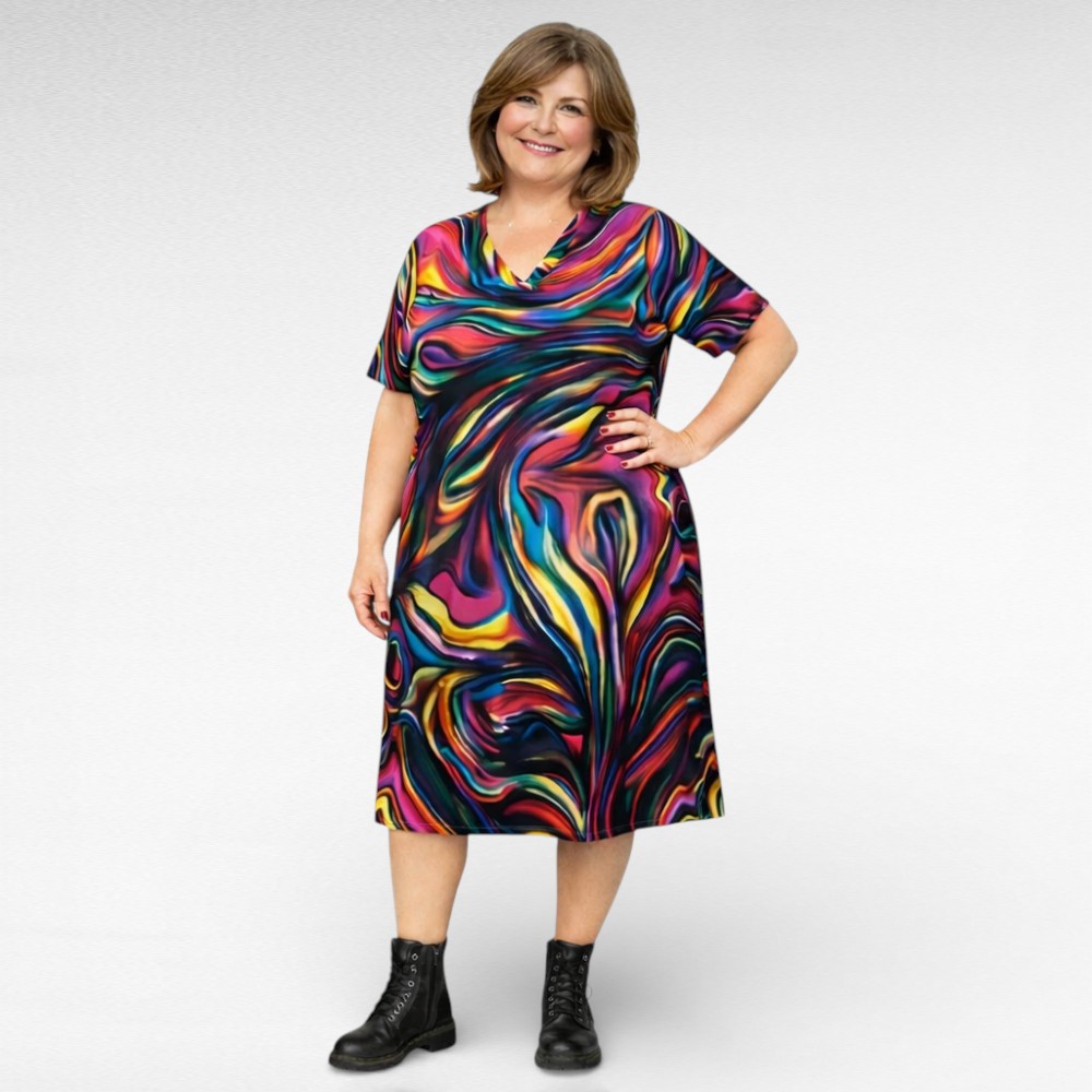 Kirkasvärinen V-kaula-aukkoinen lyhythihainen mekko “Lilybet” on valmistettu pehmeästä ja joustavasta materiaalista. Sivuilta löytyy taskut.