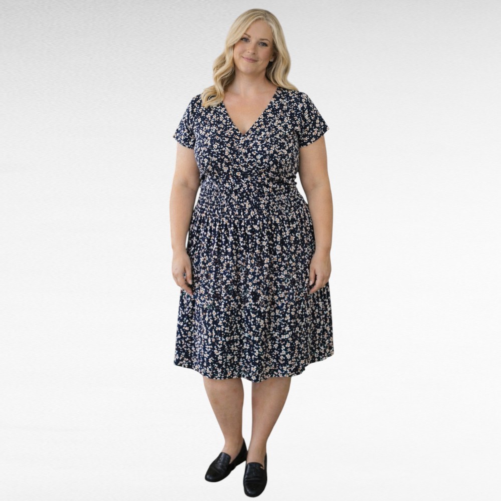 Tummansininen romanttinen englantilainen ”Joanie” kukkakuvioinen mekko, edestä napitettava pienillä samalla kankaalla päällystetyillä napeilla, jotka ovat lähes huomaamattomat. Vyötäröä korostavat neljä kapeaa vaakasuuntaista laskosta, jotka antavat kauniin muodon. Lyhyet hihat peittävät vain olkavarren yläosan, kainalo jää ilmavasti avoimeksi. Naisellinen, kevyt ja kesäisen mukava malli.