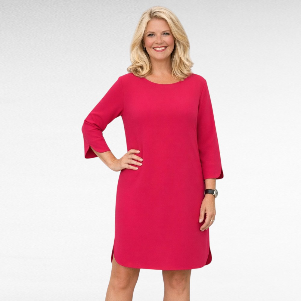 Mekko on suoralinjainen, siinä on pyöreä pääntie sekä selässä koristeellinen kolmionmuotoinen aukko. 3/4-hihojen päissä on kalvosimet, joissa on kaarevat halkiot, ja helmassa sivuilla noin 7 cm kaarevat halkiot, jotka lisäävät liikkumavapautta ja kauniin yksityiskohdan. Sopii käytettäväksi myös tunikana.