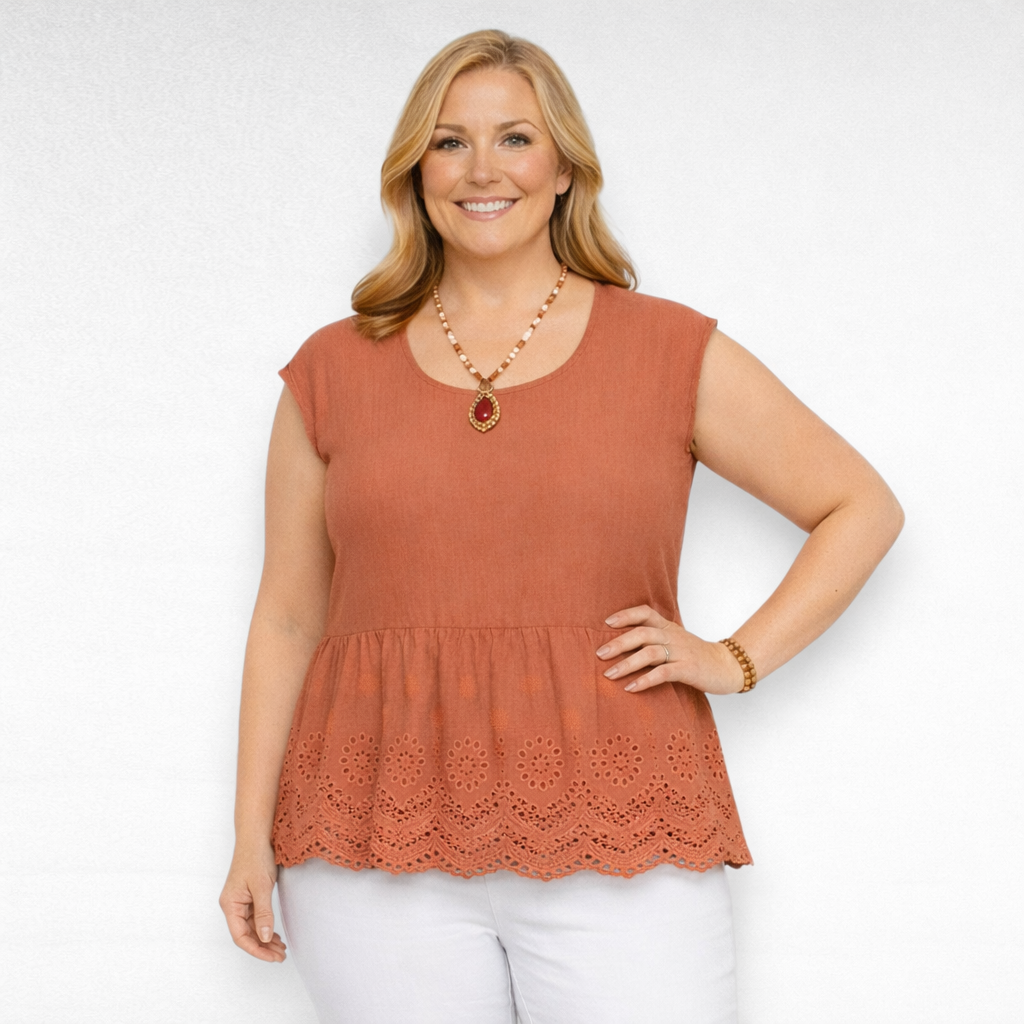 Englantilainen ”Sanoman” puuvillatunika brodeeratulla pitsillä ja leveillä röyhelöillä. Pieni nappikiinnitys takana.