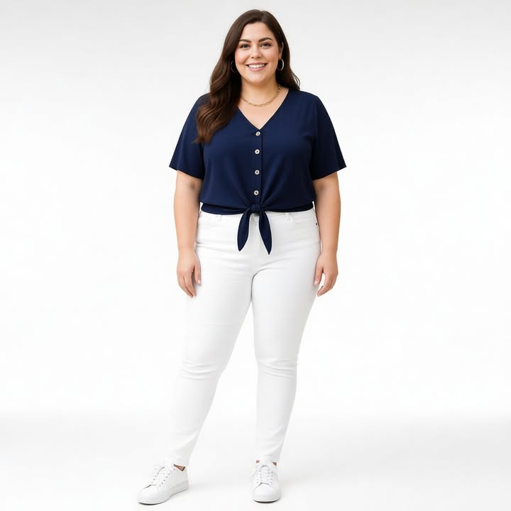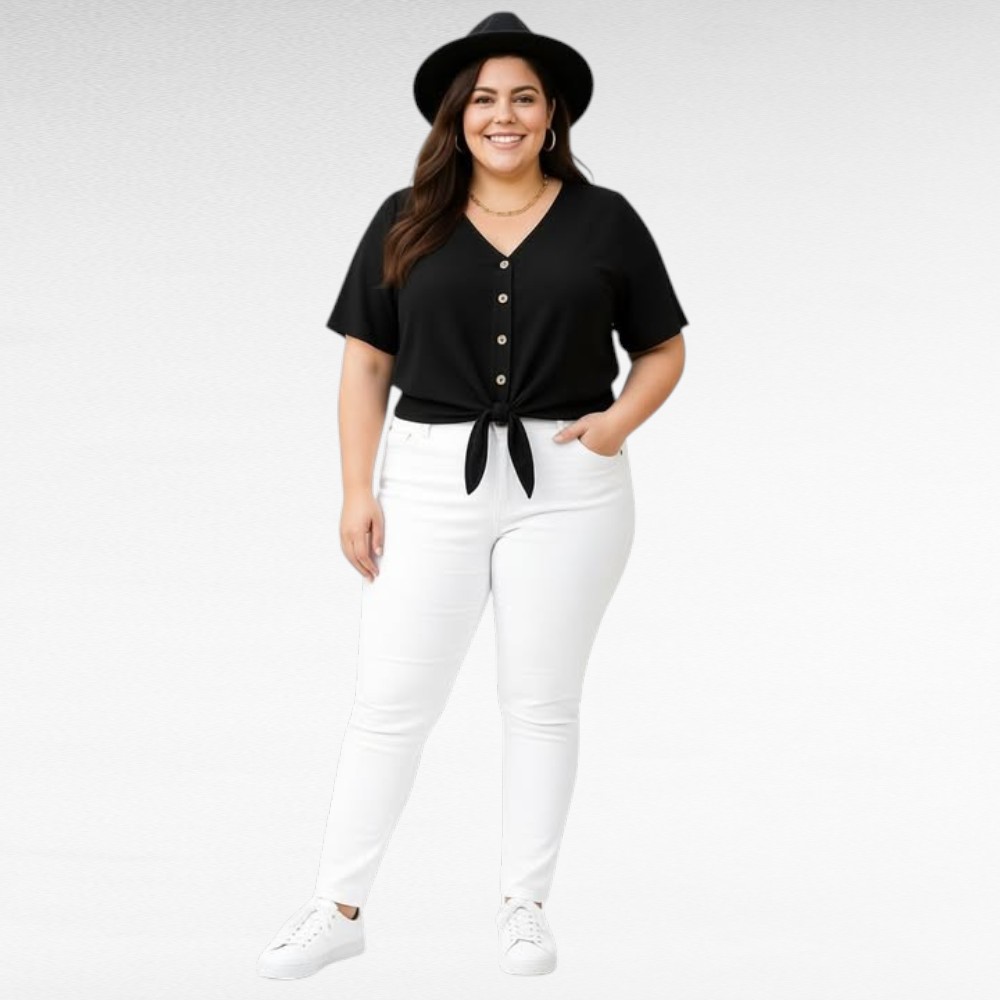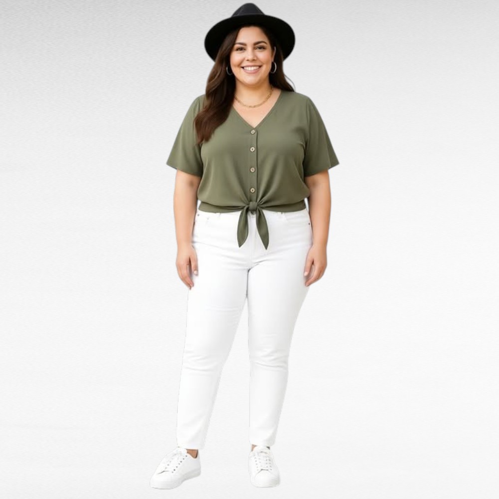 Paita voi käyttää monella tavalla: helmat voi sitoa solmuksi vatsan päälle tai pitää auki housujen tai hameen sisällä.