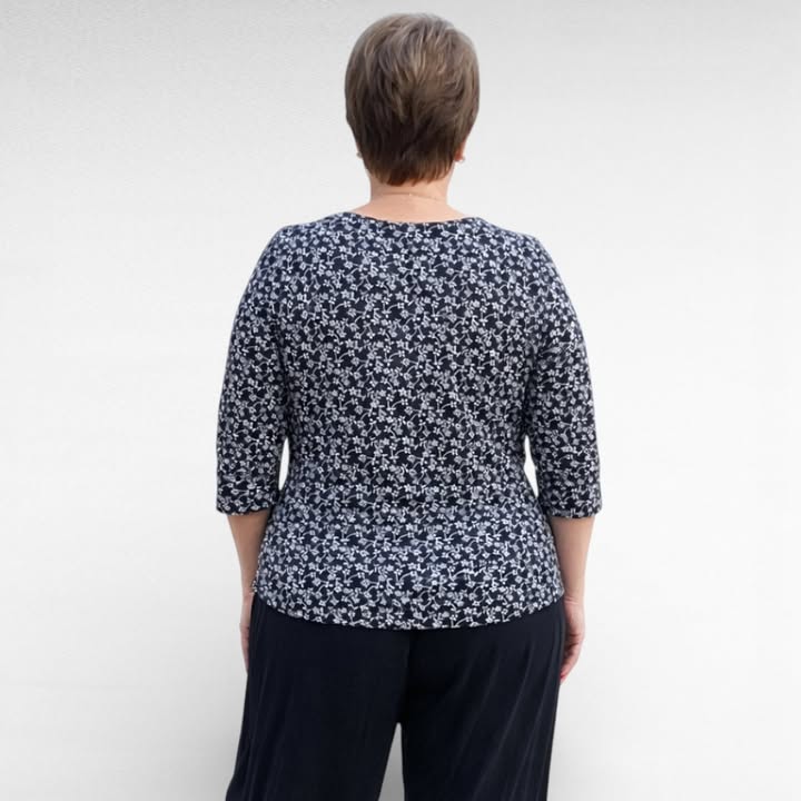Mustavalkoisella kukkakuviolla pehmeä ja mukava 2/3 hihainen pusero.
