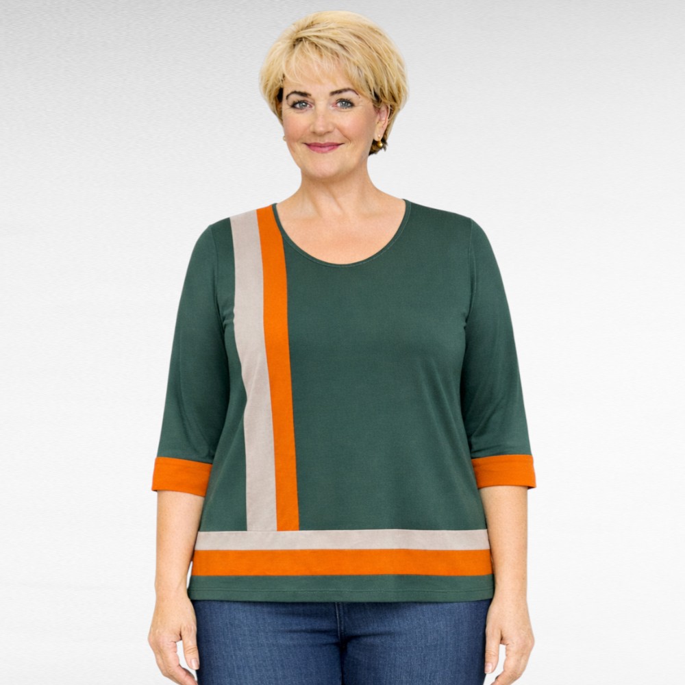 3/4-hihat on viimeistelty oranssilla käänteellä, joka tuo ilmettä ja tekee puserosta näyttävän mutta silti hillityn valinnan. Hihansuissa, oranssin osan kohdalla, on pienet halkiot, jotka lisäävät mukavuutta ja viimeistelevät yksityiskohdan kauniisti.