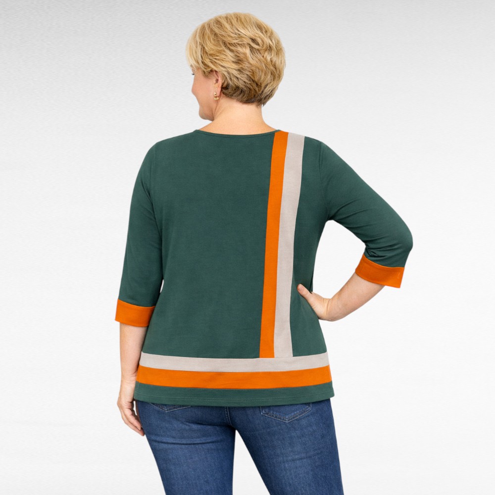 Edessä kulkeva pystysuora raita antaa vartalolle visuaalisesti hoikentavan linjan, ja helmassa sama väritys toistuu vaakasuunnassa, sitoen kokonaisuuden tasapainoiseksi.