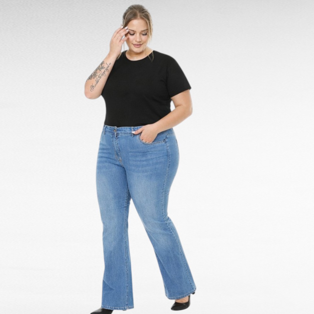 Vaaleasiniset leveälahkeiset puuvillafarkut.