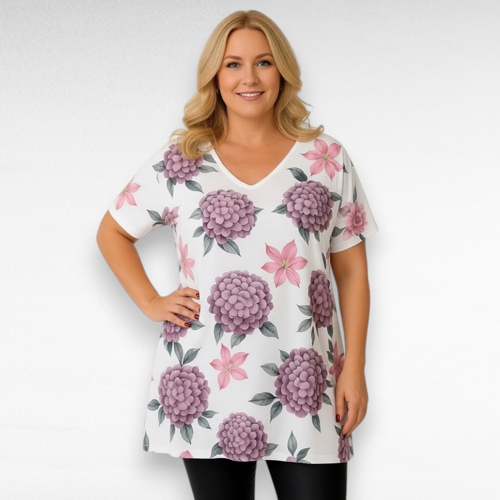 Kaunis ”Esmira Fashion”-tunika – naisellinen malli, laskeutuva A-leikkaus, helman sivuissa pienet halkiot – pehmeä, ilmava ja täydellinen arkipäiviin tai juhlavampiin hetkiin. Etuosalla hortensia ja lilja kukkakuviot, takaosa on valkoinen.