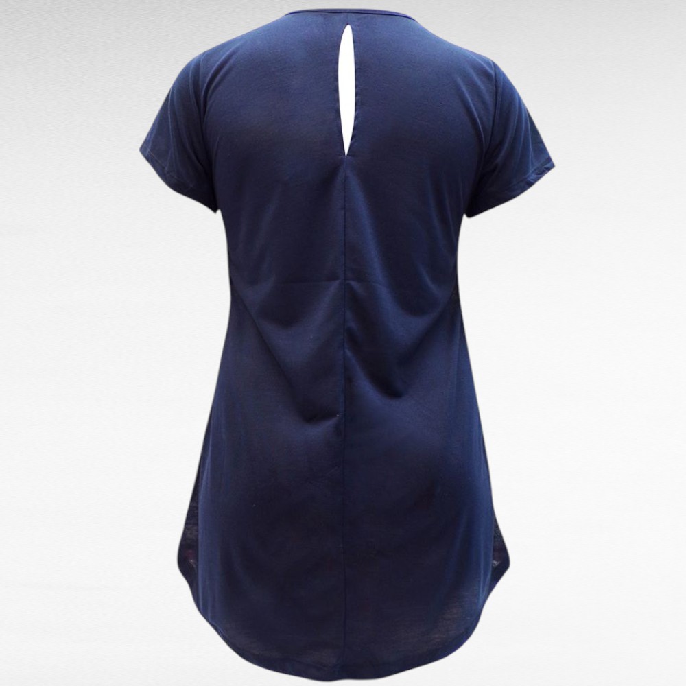 Tummansininen lyhythihainen”Ivans” tunika, jossa raidallinen vaaleanpunainen ja valkoinen kukkakuvio. Takaosa on tummansininen ja hieman pidempi kuin etuosa.