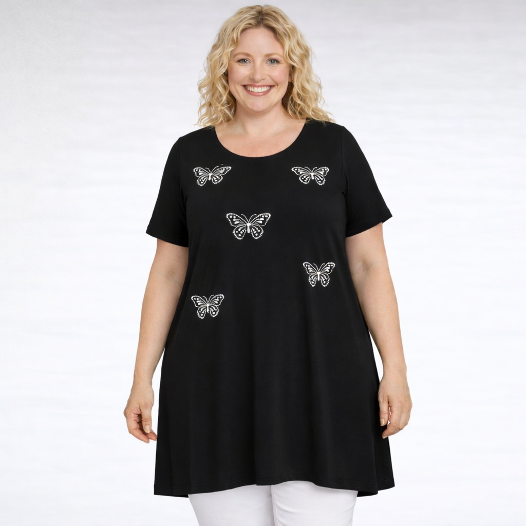 Pidempi lyhythihainen tunika ”Seraj” taskuilla. Malli levenee alaspäin. Rinnalla hopeisia helmiperhosia.