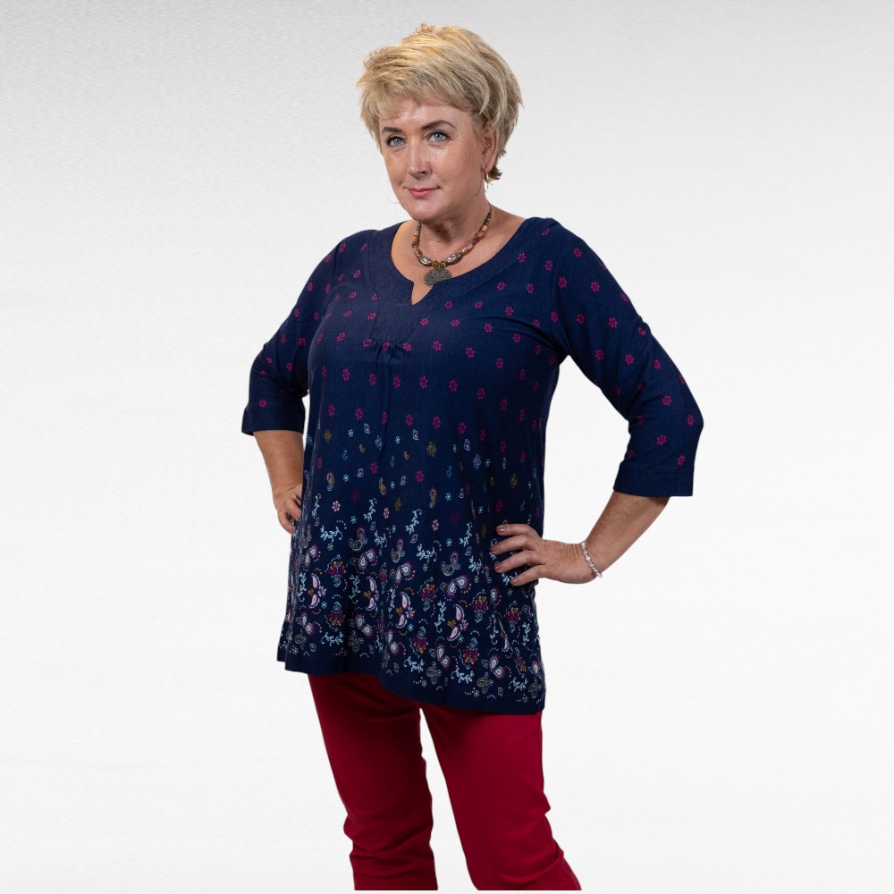 Tummasininen ”Blancheporte” tunika kirjavalla kukkakuviolla.