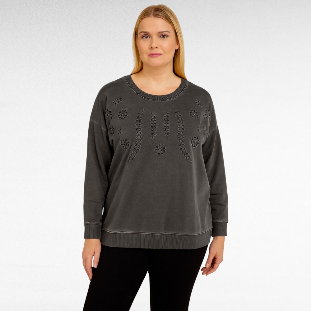 Tummanharmaa pitkähihainen collegepaita brodeeratulla etuosalla – ”Janet & Joyce” (Iso-Britannia)
