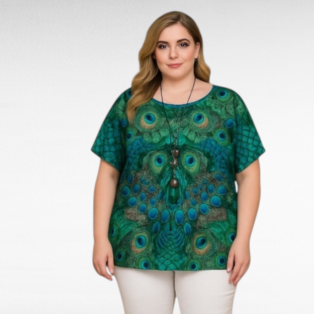 Kaunis, isoilla ja näyttävillä riikinkukon kuosilla lyhythihainen pusero. Sama upea kuosi sekä edessä että takana! Materiaali on erittäin miellyttävä, pehmeä ja joustava – täydellinen arkeen tai juhlaan.