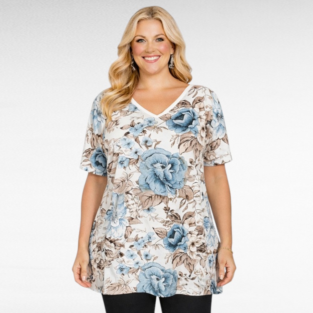 Mukava, pehmeästä ja joustavasta materiaalista V-pääntiellinen, A-mallinen valkoinen “Esmira FASHION” tunika, jossa on lyhyt hihat ja etuosalla kaunis ruusukuvio. Selkäosa on kokonaan valkoinen.