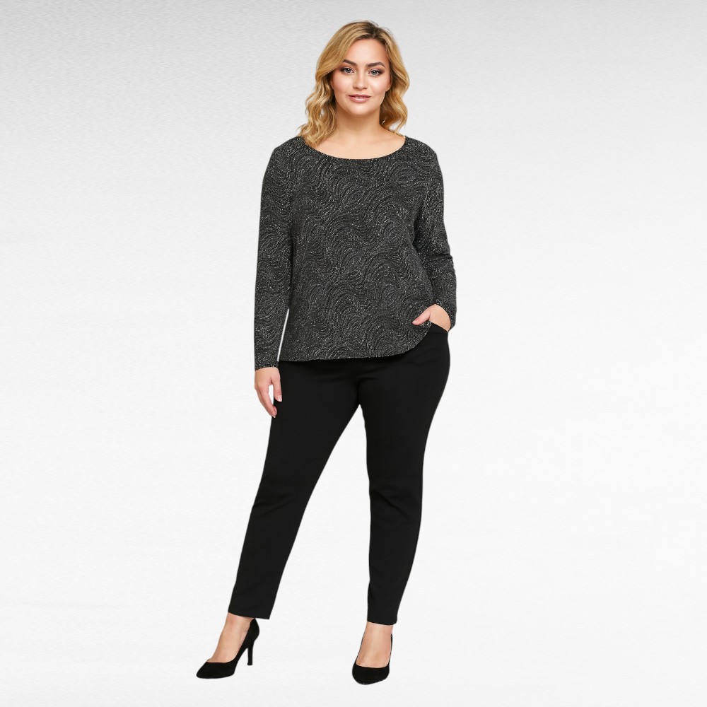 Tyylikäs musta pusero hienovaraisella kimalluksella. Kaunis aaltokuvio, miellyttävä materiaali ja imarteleva istuvuus. Sopii täydellisesti sekä juhlaan että arkeen.