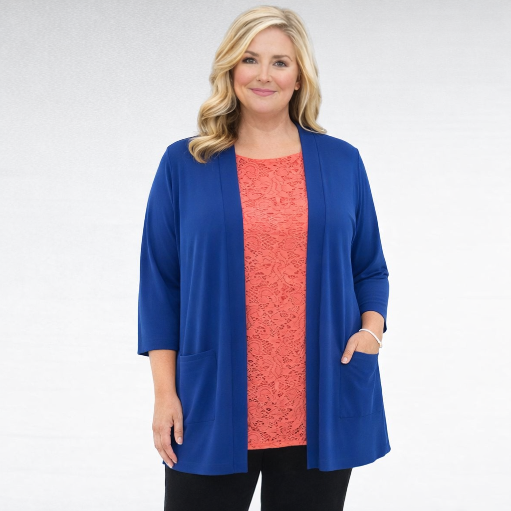 Tämä kevyt, pehmeä ja joustava taskullinen yksivärinen kardigaani on luotu olemaan arjen luottovaate. Hieman levenevä malli lisää siroutta, ja vaate istuu väljästi ja kauniisti myös isommissa ko’oissa.