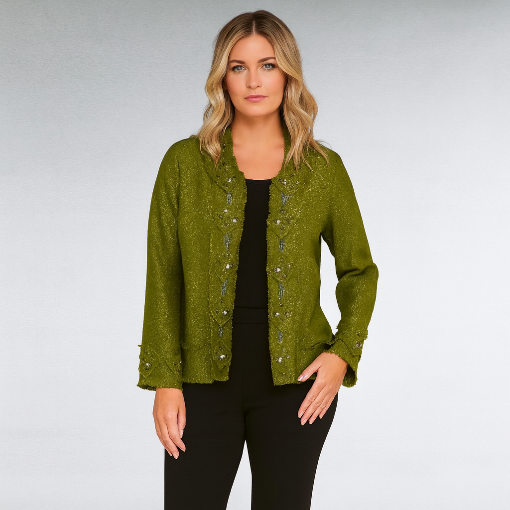 Elegantti avonainen”Gerard” jakku, jossa on kauniisti struktuurinen kangas ja huolittelemattomat reunat, jotka tuovat vaatteeseen pehmeää, käsityömäistä ilmettä. Jakku on edestä avoin, ja rinnan sekä hihansuiden kohdalla olevat metallikoristeet lisäävät hillittyä säihkettä ja juhlavaa viimeistelyä. Klassinen leikkaus sopii erinomaisesti niin juhlavampiin hetkiin kuin arvokkaaseen arkipukeutumiseen.