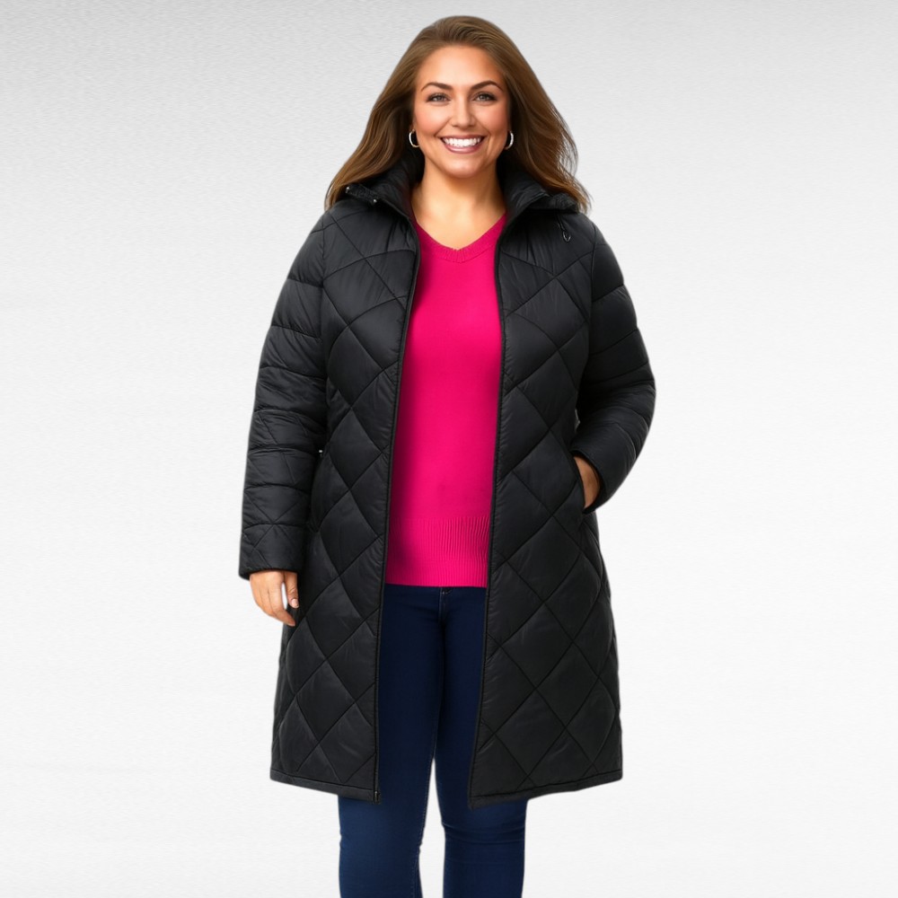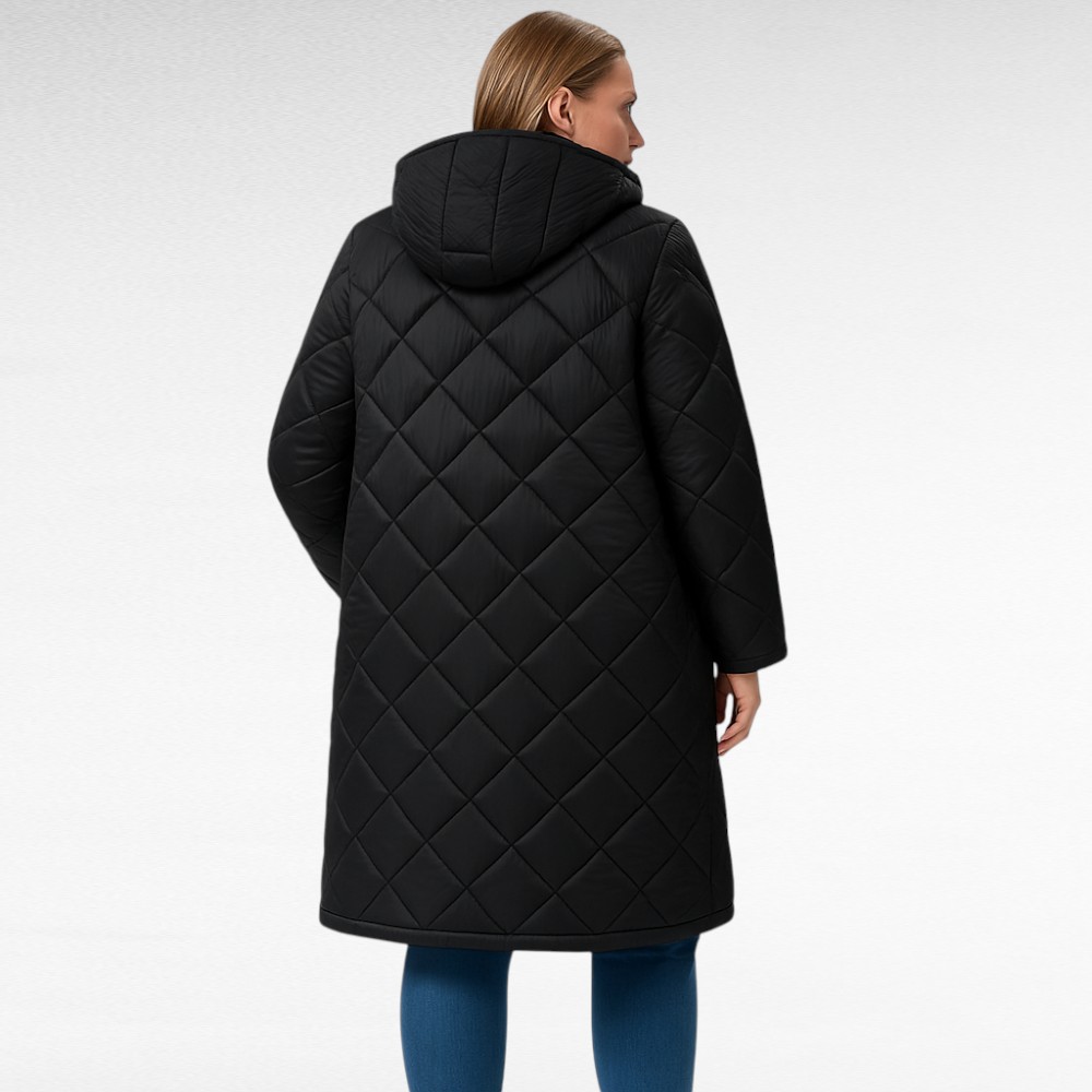 Tyylikäs ja käytännöllinen musta, tikattu pidempi toppatakki, jossa on taskut ja huppu. Toppatakki sopii erinomaisesti sekä syksyn viileisiin päiviin että talven pakkasiin.
