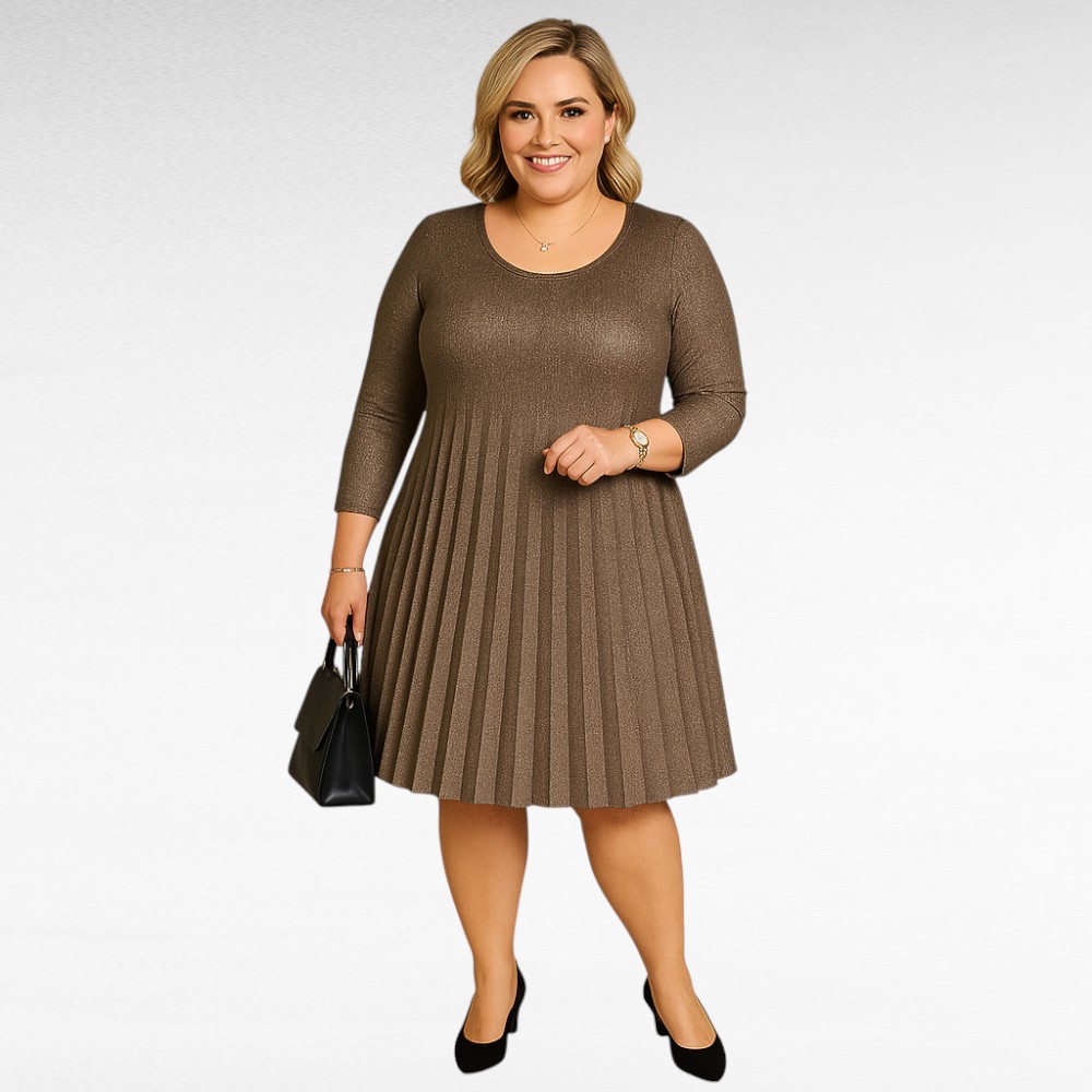 Erittäin kaunis mokkaruskea, hohtava sävyinen levenevähelmainen pitkähihainen lyhyempi pliseerattu mekko/tunika “Italy Moda”,