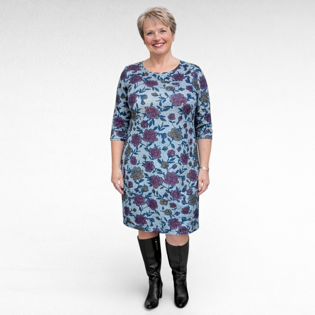 Vaaleaharmaa ”Aeliite” mekko viininpunaisella ruusukuviolla . Suoramalli, 2/3hihat, joustava materiaali.
