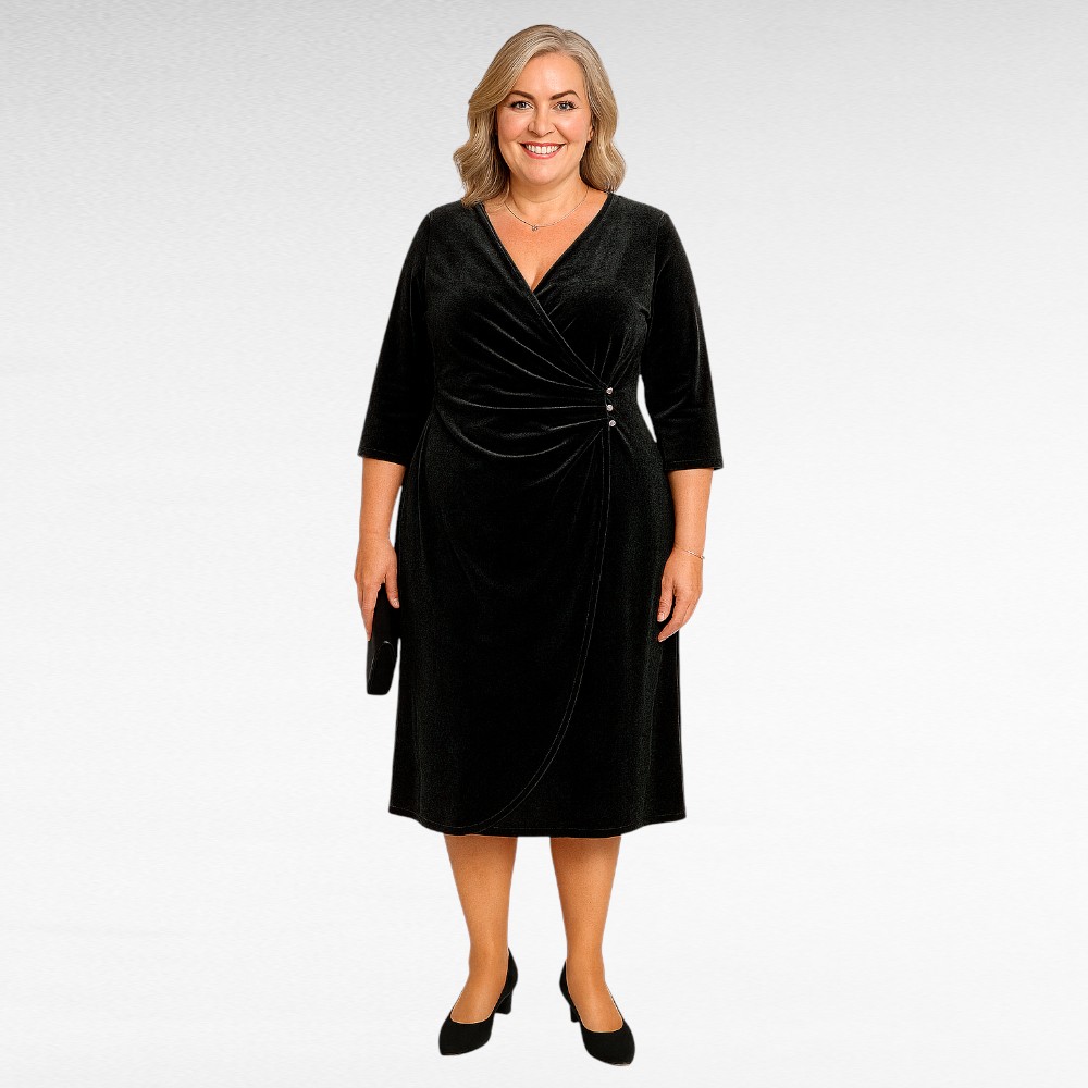 Vihreä tai musta ”Ellos” samettimekko, jossa puolipitkät hihat ja gingham-leikkaus. Helma on ommeltu kiinni toiselta puolelta eikä ole auki. Hopeanväriset napit vyötäröllä ja hihoilla.