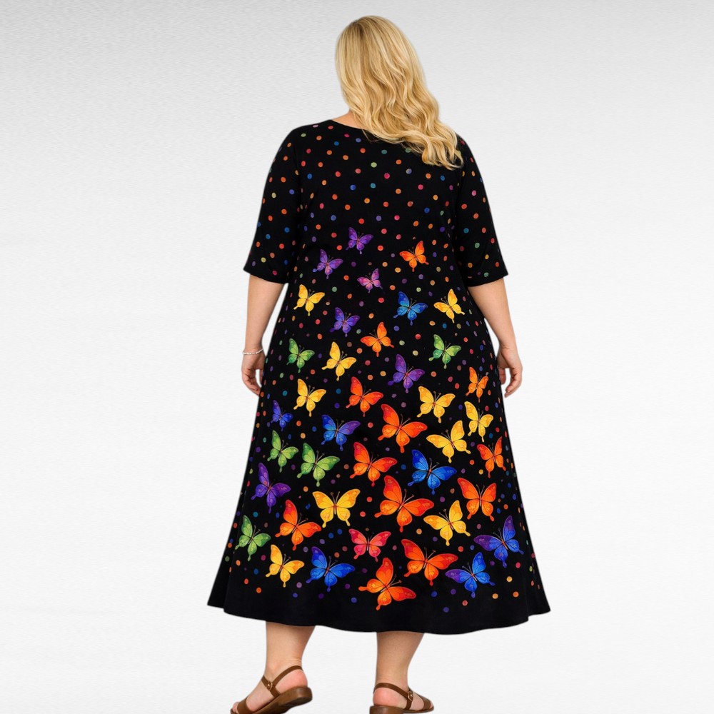 Kaunis A-linjainen V-pääntiellä maksimekko ”Mirelle”, jossa on hihat kyynärpään asti ja näyttävä perhoskuosi.