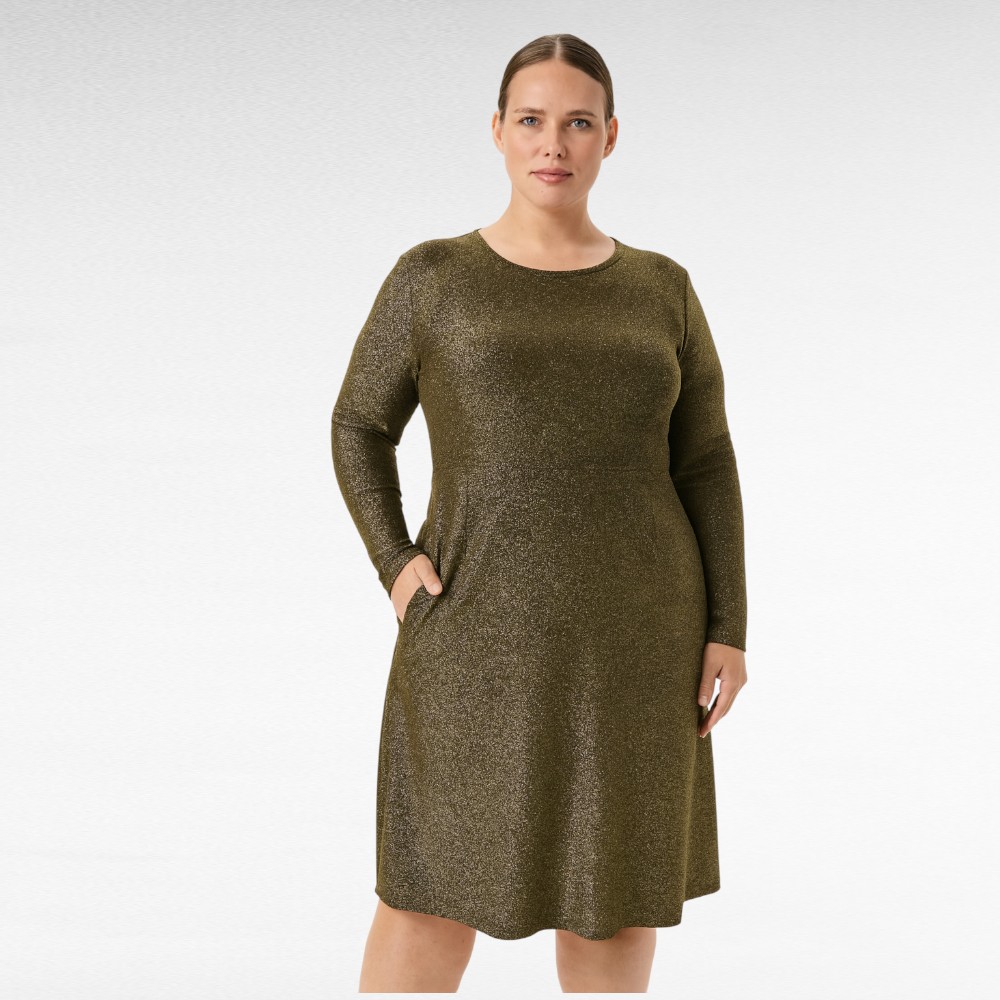 Juhlava pronssivärinen, kimalteleva ja hyvin laskeutuvasta  erittäin joustavasta materiaalista mekko, jossa on pitkät hihat ja taskut. Pidemmällä henkilöllä mekko näyttää tunikalta ja sopii hyvin esim. housujen kanssa käytettäväksi.