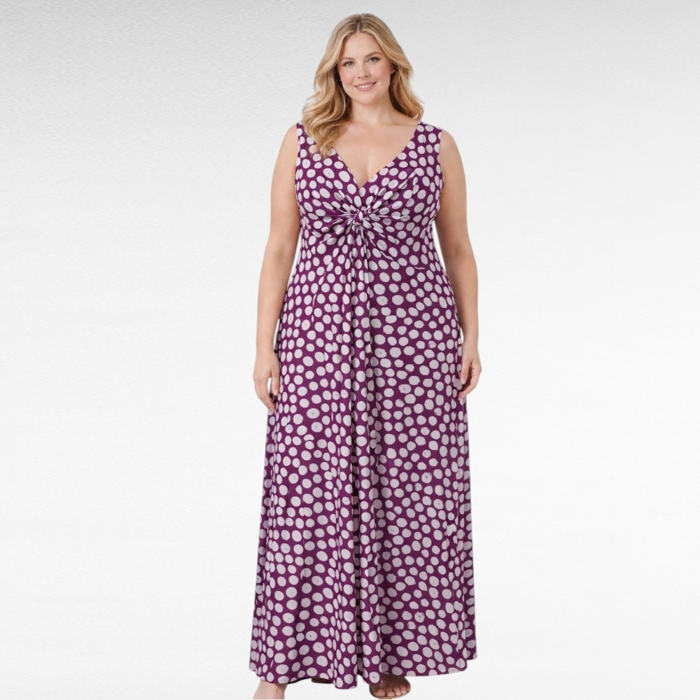 Violettipohjainen hihaton ”GRACE” maksimekko, jossa kaunis valkoinen pilkkukuvio. Tämä naisellinen mekko on suunniteltu erityisesti pidemmälle vartalolle ja valmistettu laadukkaasti Englannissa.