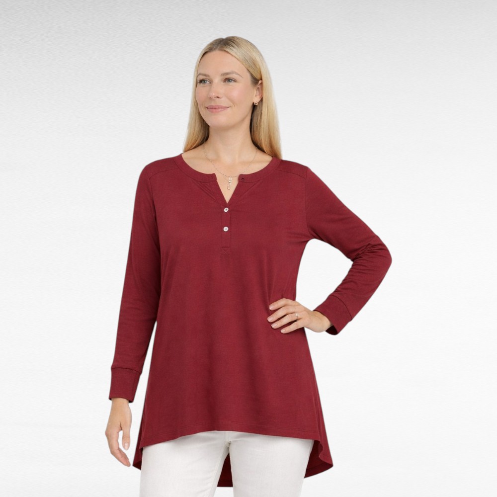Viininpunainen, pehmeä ja kauniisti laskeutuva pusero, joka sopii erinomaisesti arkeen. Yläosassa avoin pääntie ilman ensimmäistä nappia antaa rennon ilmeen, ja nappilista tuo klassista linjaa. Etuosa on noin 8 cm takaosaa lyhyempi, sivuissa on halkiot ja hihoissa 5 cm leveät mansetit.