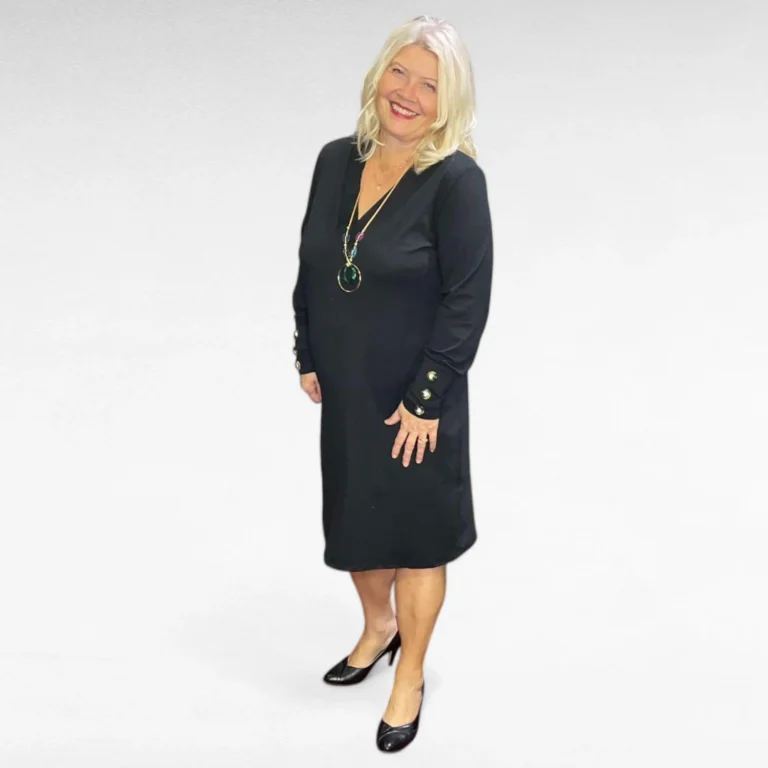 Musta, v-pääntiellä pitkähihainen suorainen trikookangasmekko ”Berta”.