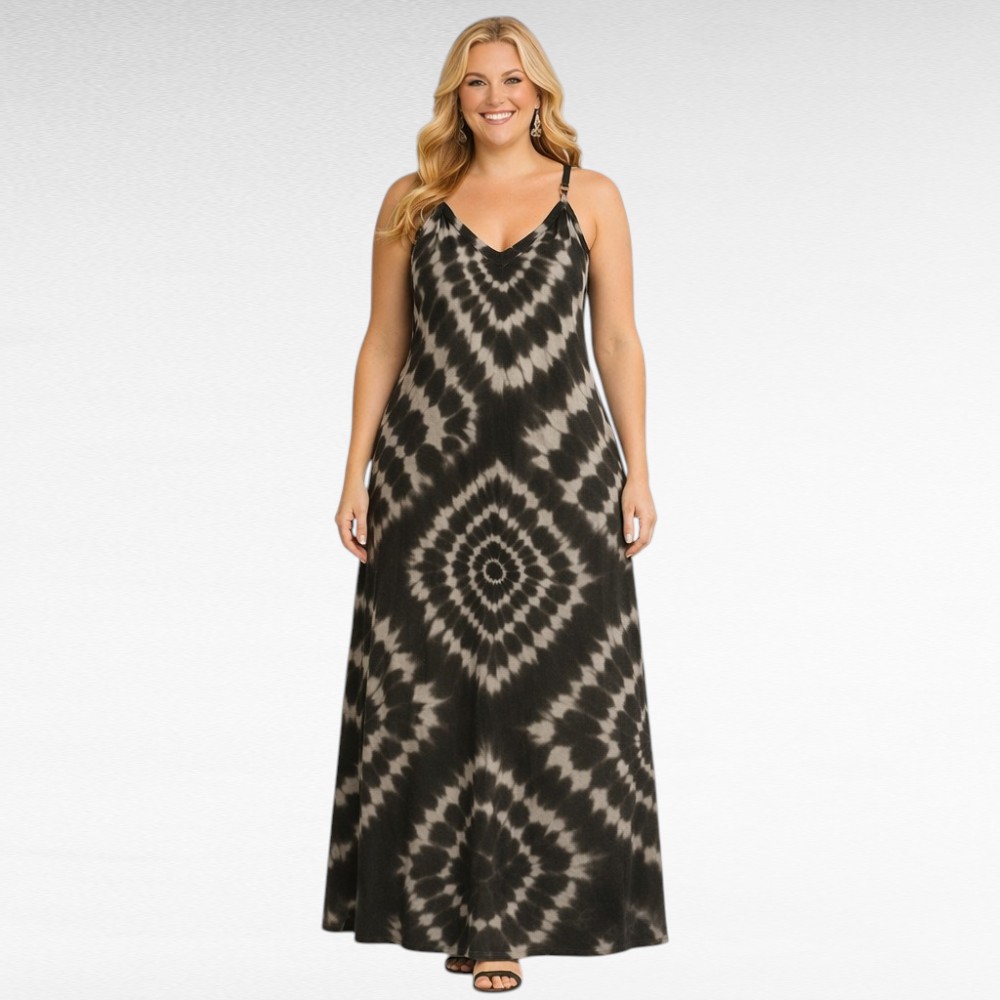 Kaunis kesäinen maksimekko, jossa on säädettävät olkaimet ja harmaa-valkoinen batikkikuvio. Iso-Britanniasta, merkiltä ”Johanna Hope”