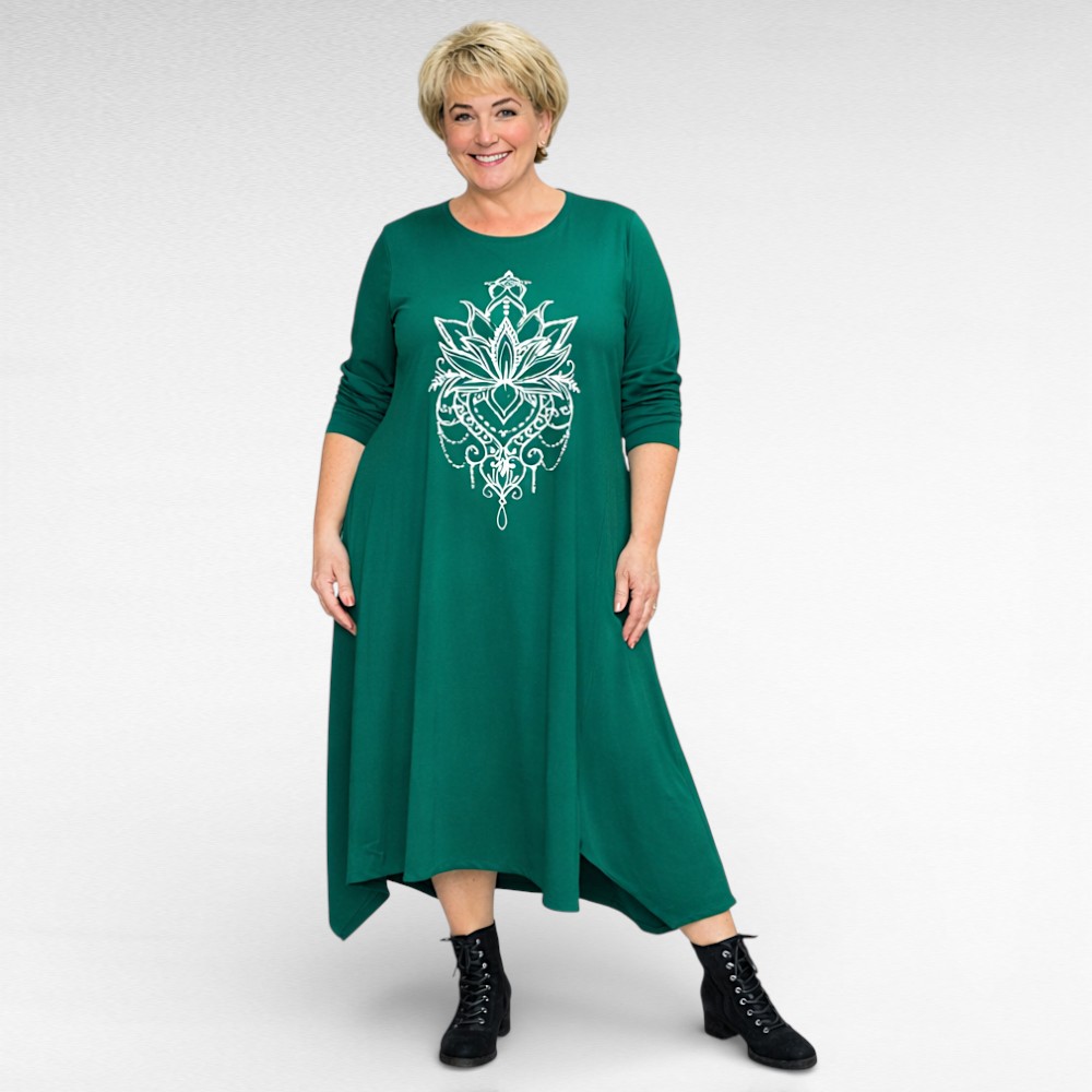 Laadukasta materiaalista vihreä ”Seraj” puuvillamekko, jossa on etuosassa suuri valkoinen ja kirjava onnea tuova mandala-kuvio .