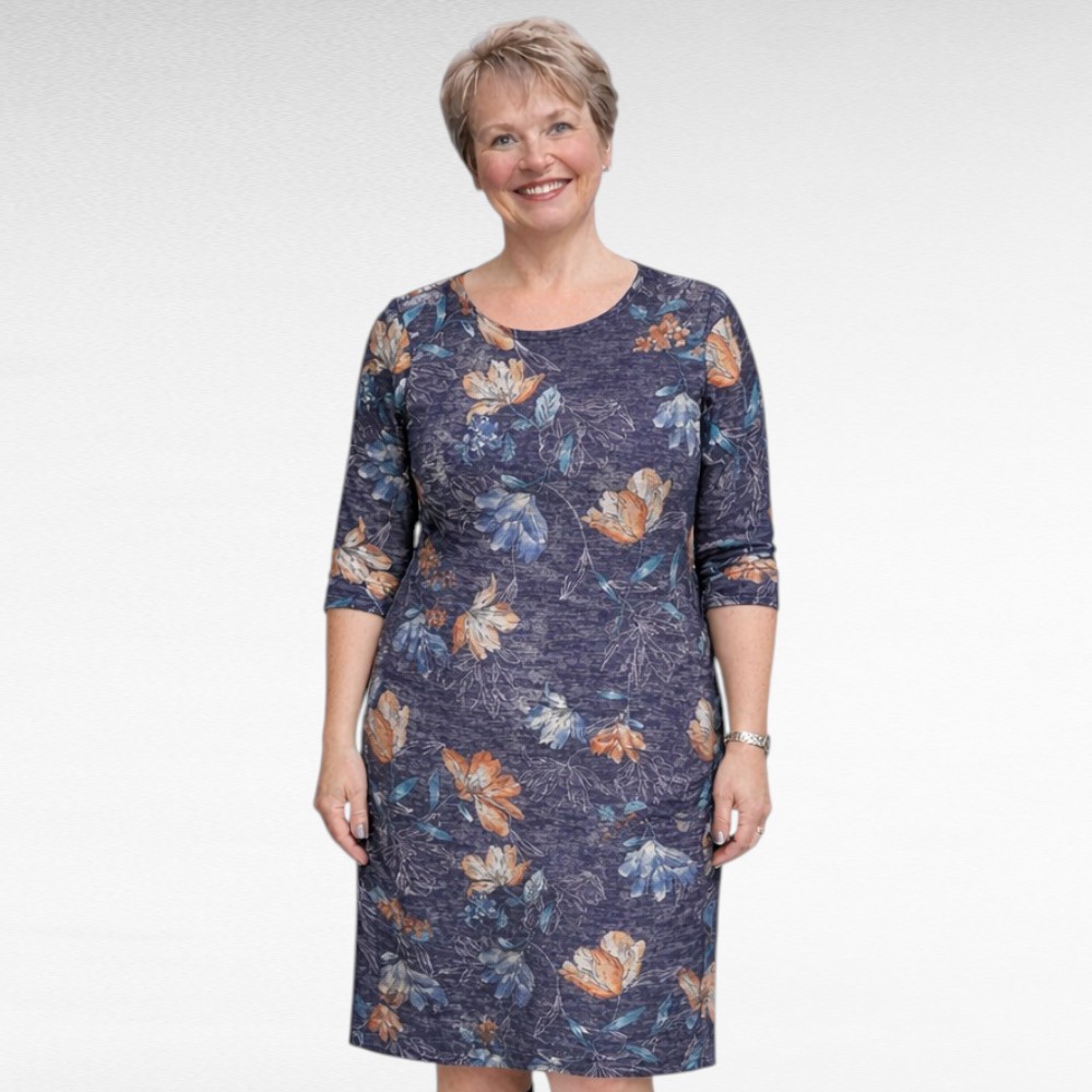 Klassisen mallinen, mukava joustava ”Laura”mekko arkeen ja hieman juhlavampiinkin hetkiin. Tummansininen pohja ja kaunis kukkakuosi luovat rauhallisen mutta naisellisen ilmeen. Pyöreä pääntie ja 3/4-hihat tuovat ajattoman ja käytännöllisen viimeistelyn, ja pehmeä, joustava materiaali takaa hyvän istuvuuden.