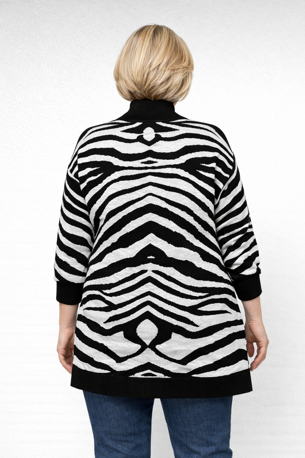 ”Brave Soul” lämmin pitkä neule mustavalkoisella seeprakuviolla. Olkapäät ovat hieman pidennetyt, hihat leveät. Hihanpäissä, alahelmalla ja pääntiellä resorit ( musta joustinneule).