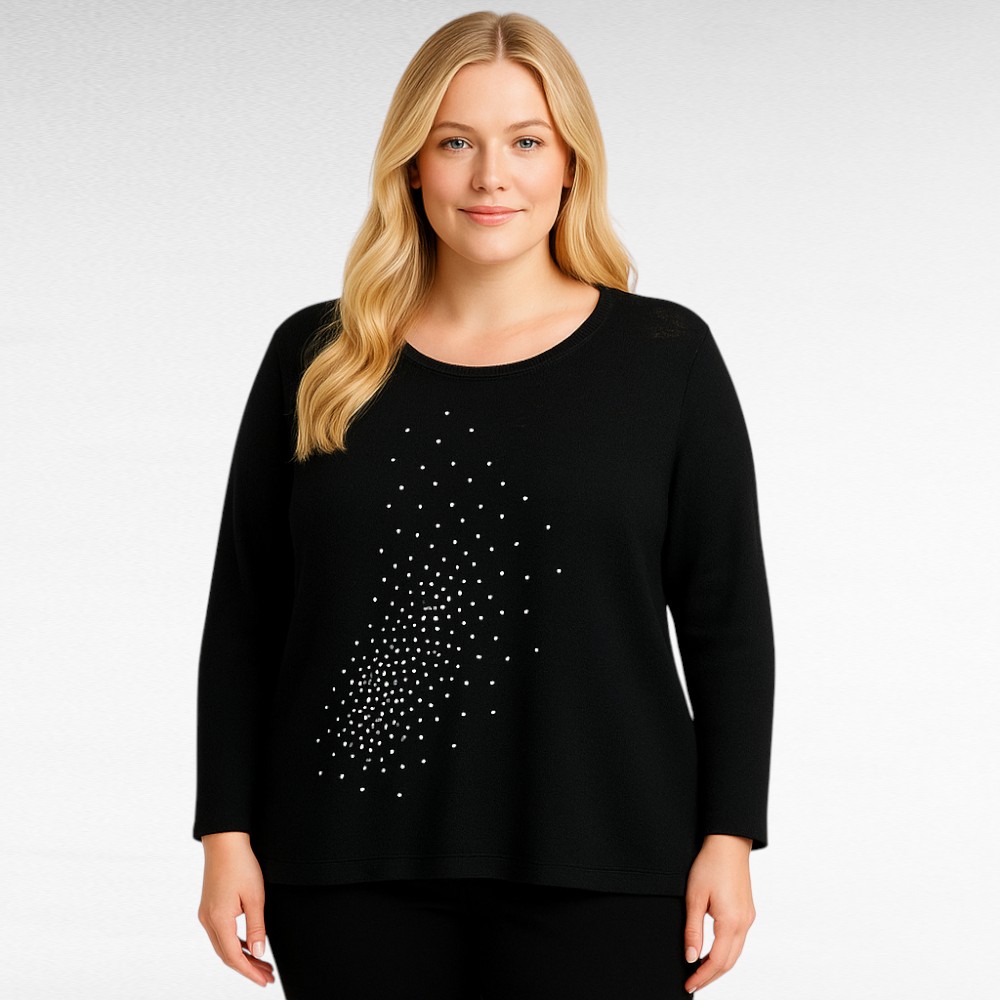 Musta ohut neule, jonka etupuolta koristavat kevyesti kiiltävät valkoiset helmet. Merkki: ”Seppälä”.