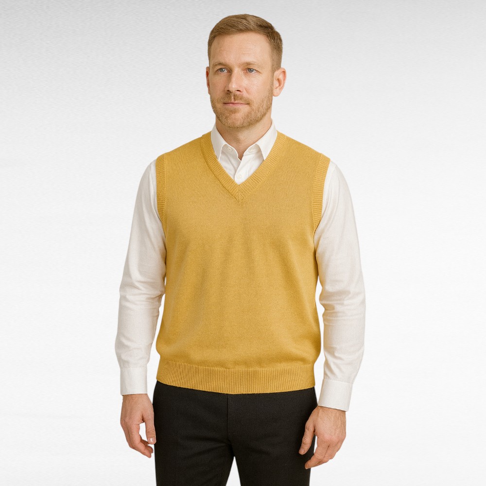 Sinappikeltainen neuleliivimme”MR. Marten” on suunniteltu heille, jotka arvostavat hillittyä eleganssia ja laatua. Huoliteltu V-pääntie, vahvat resorit ja tyylikäs värisävy luovat ilmeen, johon voi aina luottaa.