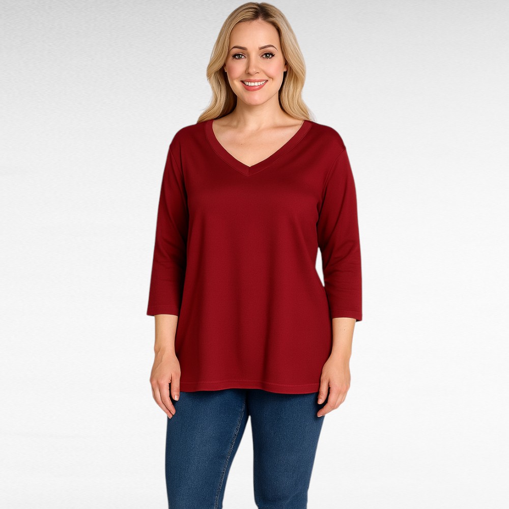 Pehmeä ja miellyttävä punainen pusero ”YOUR LIFE YOUR FASHION” on ajaton perusvaate, joka sopii hyvin arjen menoon . V-pääntie tuo yläosaan keveyttä ja avaruutta, imarrellen useimpia vartalotyyppejä. 3/4-pituiset hihat tekevät mallista käytännöllisen ja monikäyttöisen ympäri vuoden.